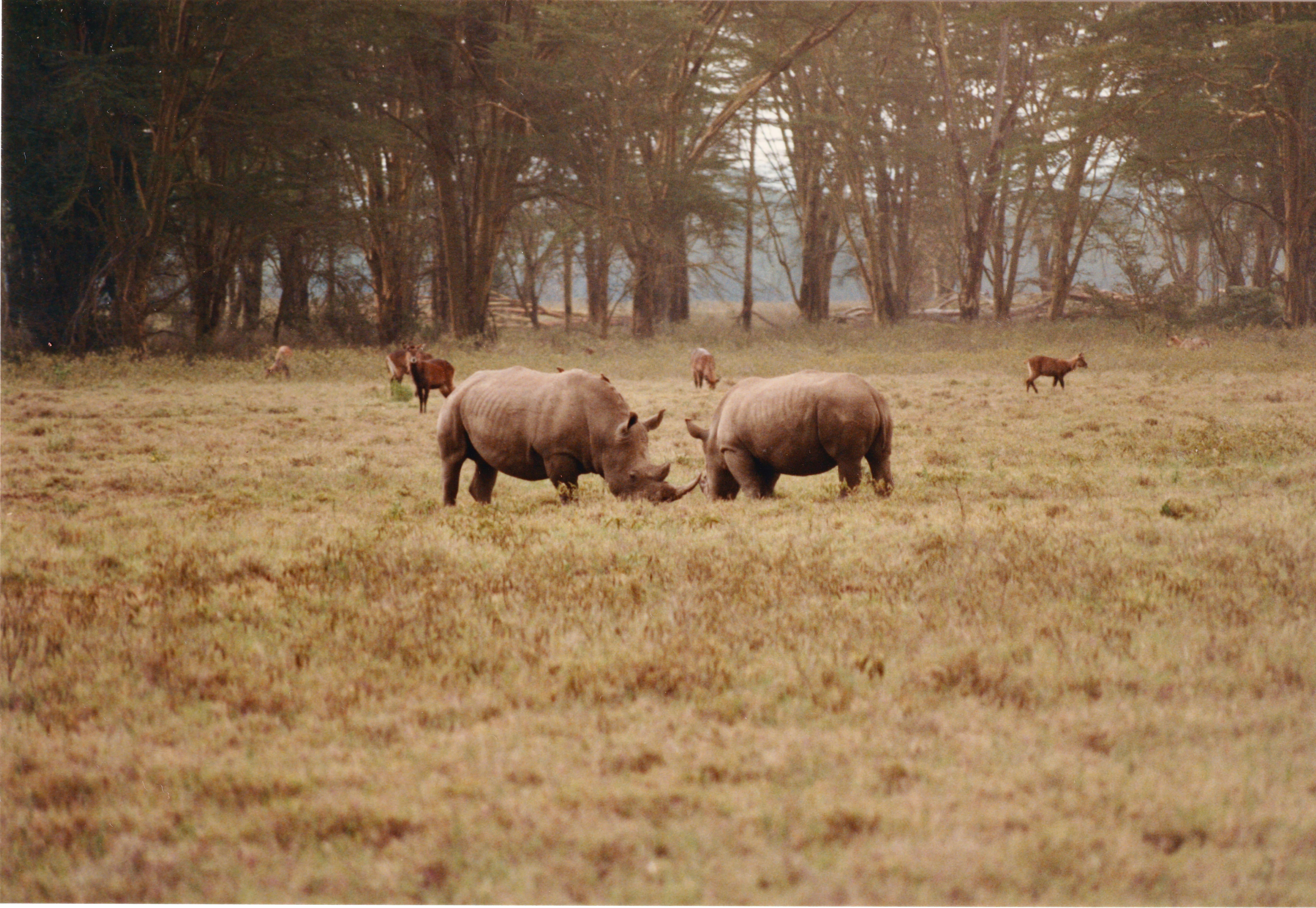 26. Above are white rhino's, harte beast and Topi. The white bird is a yellow billed stork.